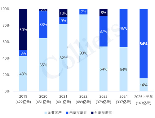 2019-2025年上半年上海辦公樓成交買家類型占比(按交易金額)