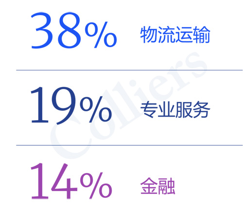 近幾個季度以來,物流企業(yè)租賃活躍度持續(xù)提升,本季度部分頭部企業(yè)因進行大面積搬遷,貢獻了顯著的租賃成交量,推動物流行業(yè)躍居需求來源首位。專業(yè)服務(19%)與金融(14%)則分別位列第二和第三位。