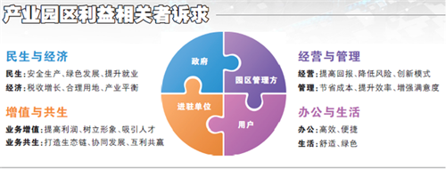 產(chǎn)業(yè)地產(chǎn)和園區(qū)已經(jīng)成為人口和生產(chǎn)的聚集地。高新技術(shù)的加持,使園區(qū)從基于“單點作業(yè)、生產(chǎn)優(yōu)先”的被動服務(wù)方式,向“多點聯(lián)合、以人為本”的主動服務(wù)方式轉(zhuǎn)變。園區(qū)將提升利益相關(guān)者的體驗感和滿意度,視為園區(qū)智慧化發(fā)展的核心,但是不同的利益相關(guān)者有不同的訴求。