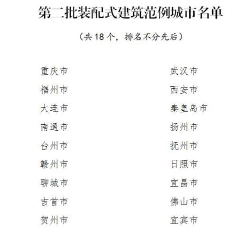9月15日電 據(jù)住建部網(wǎng)站消息,住建部辦公廳15日發(fā)布《關于認定第二批裝配式建筑范例城市和產(chǎn)業(yè)基地的通知》(以下簡稱《通知》),認定重慶市等18個城市為第二批裝配式建筑范例城市,天津市現(xiàn)代建筑產(chǎn)業(yè)園區(qū)等12個園區(qū)、北京建工集團有限責任公司等121家企業(yè)為第二批裝配式建筑產(chǎn)業(yè)基地。