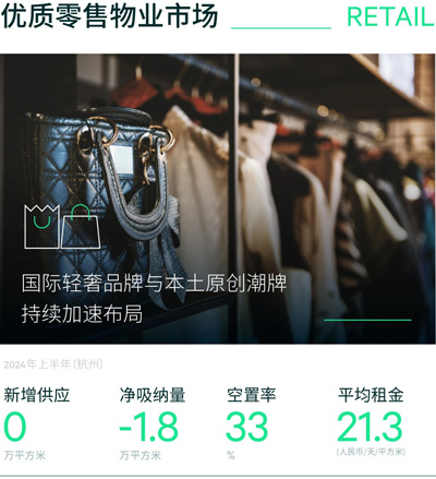 需求方面,本季度市場近需求近四成來自于中餐、各類甜點面包與茶啡店為代表的餐飲品類,期內(nèi)錄得包括柿圓、葉馬、敏華冰廳、FADAJE法大吉面包和WenTinG半糖蛋糕等品牌積極布點。時尚服飾業(yè)態(tài)占比24%,以輕奢、設計師品牌和運動戶外品類較為活躍。CELINE精品店與Maison Margiela杭州第二家于萬象城揭幕,Tory Burch與ON跑于嘉里中心開業(yè)。此外新能源汽車持續(xù)布局線下渠道,上半年蔚來分別在萬象城、龍湖濱江天街與嘉里中心拓店。而隨著小米SU7正式上市,小米之家汽車體驗店,浙江首店在拱墅大悅城正式亮相,門店設置有車輛產(chǎn)品展廳、3C產(chǎn)品展示和多功能區(qū),實現(xiàn)了小米“人車家全生態(tài)”的升級。截至季末,全市空置率小幅上升至3.3%,環(huán)比上升0.2個百分點,同比上升0.6個百分點。