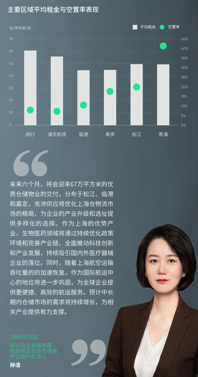 需求結(jié)構(gòu)而言,以三方物流占據(jù)絕對(duì)主導(dǎo),占比達(dá)68%。短期租賃交易增多,反映當(dāng)下租戶對(duì)成本可控與租期靈活的需求上升,錄得化工物流租戶在金山的擴(kuò)租8,000平方米,某三方物流客戶在金山短租5,000平方米。除此以外,集裝箱物流供應(yīng)商,快遞快運(yùn)等租戶均有1萬(wàn)平方米及以上的布局,西北物流園區(qū)的拆遷促使三方物流租戶遷至寶山。制造業(yè)居次位,以醫(yī)療器械和家電家居為主;钴S區(qū)域主要集中在成熟市場(chǎng)寶山、浦東機(jī)場(chǎng),以及具備價(jià)格優(yōu)勢(shì)的金山和奉賢。上半年凈吸納量為-24.1萬(wàn)平方米,空置率上升至26.5%,一方面是受新增供應(yīng)的影響,另一方面受退租影響,退租原因包括食品,護(hù)膚品和家居行業(yè)的縮減面積或整合,進(jìn)出口業(yè)務(wù)下滑以及新能源汽車相關(guān)企業(yè)的重新選址。