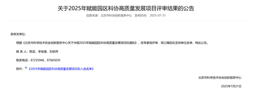 空口無憑,實力說話。2025年7月,園區(qū)成功入選北京市科協(xié)"賦能園區(qū)科協(xié)高質(zhì)量發(fā)展項目"(全市僅20家),這意味著: