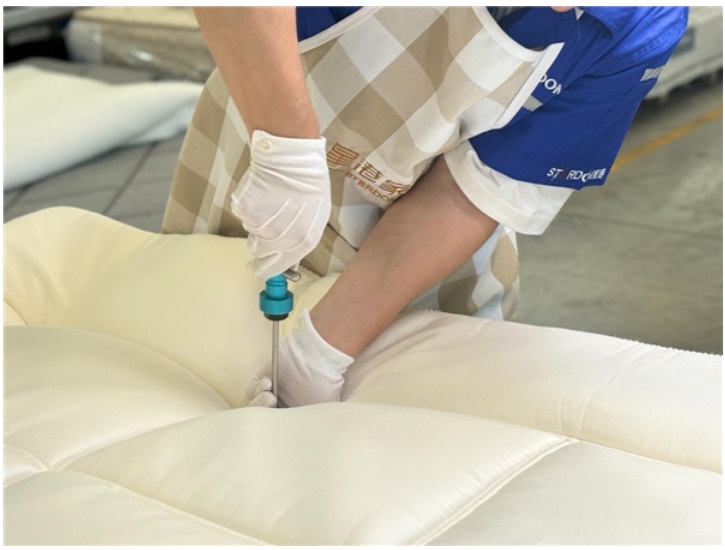 ·手工鋪設(shè)內(nèi)材:匠人如同經(jīng)驗豐富的主廚,親手甄選并鋪陳每一層天然材料——從柔韌的乳膠到支撐的棉層,憑借手感精準(zhǔn)把控其厚度與張力。這確保了床墊內(nèi)材結(jié)構(gòu)松緊得當(dāng),呼吸感十足,為實現(xiàn)精準(zhǔn)貼合打下堅實基礎(chǔ)。