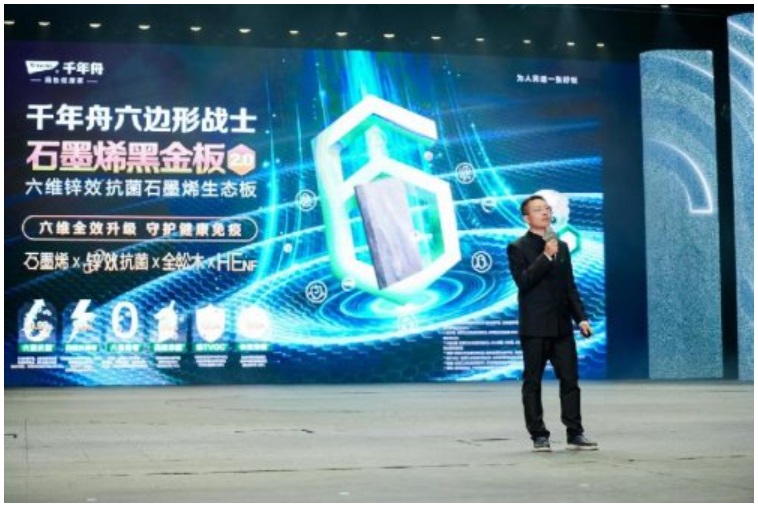 千年舟創(chuàng)研的石墨烯黑金板,運(yùn)用航天級(jí)科技石墨烯材料,實(shí)現(xiàn)99.99%高效抗菌率、99.9%抗病毒活性率,還具有0級(jí)防霉標(biāo)準(zhǔn)、凈醛、除TVOC功能。此次發(fā)布會(huì)上推出2.0版本,在原有基礎(chǔ)上迭代升級(jí),增加“除螨”“抗寵物病毒”兩大功能,螨蟲驅(qū)避率>60%,打造真正的“六邊形戰(zhàn)士”。