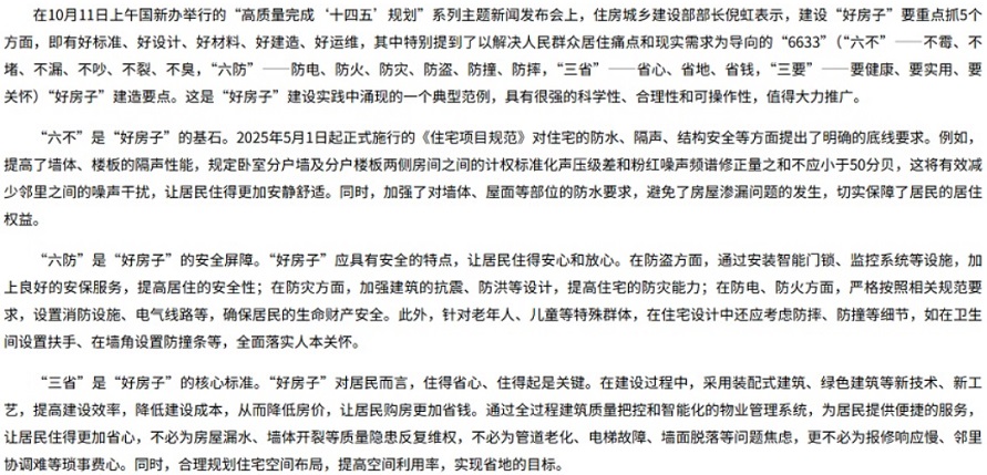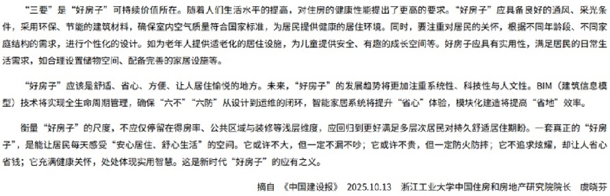 住建部部長(zhǎng)倪虹以“6633”標(biāo)準(zhǔn)系統(tǒng)闡釋了“好房子”應(yīng)具備的基本特質(zhì)