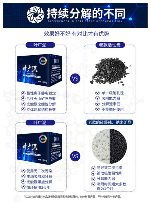 葉廣泥和活性炭不一樣,活性炭只能吸附,用一段時間以后吸附會飽和,葉廣泥不僅僅是吸附,是吸附后可以分解有害物質(zhì),不會再釋放,不需要暴曬,可以持久分解,使用3年。