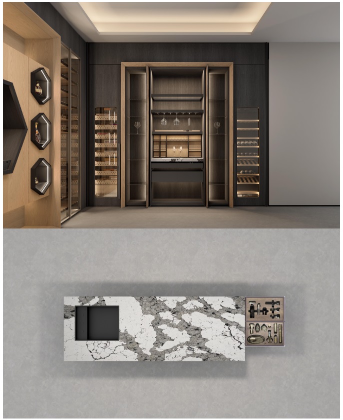 同時(shí),中島配備嵌入式恒溫酒柜與雪茄柜,以“顯”的通透格局,展現(xiàn)收藏的氣度,酒杯酒具則以“隱”的巧思設(shè)計(jì),將雜亂轉(zhuǎn)為有序,構(gòu)筑出一方令人沉浸的社交秘境。中島桌面可調(diào)光旋鈕可隨心定義空間情緒,讓收藏、品鑒、社交在一方空間內(nèi)流暢銜接。隱藏式水槽配置沖杯器與升降龍頭,凈杯、凈手、凈心,品酒儀式感油然而生。整個(gè)酒窖空間既可作為明亮的珍藏展廳,也能切換為暖黃的社交秘境,在酒的光影之間,重塑屬于當(dāng)代人的棲心之地。