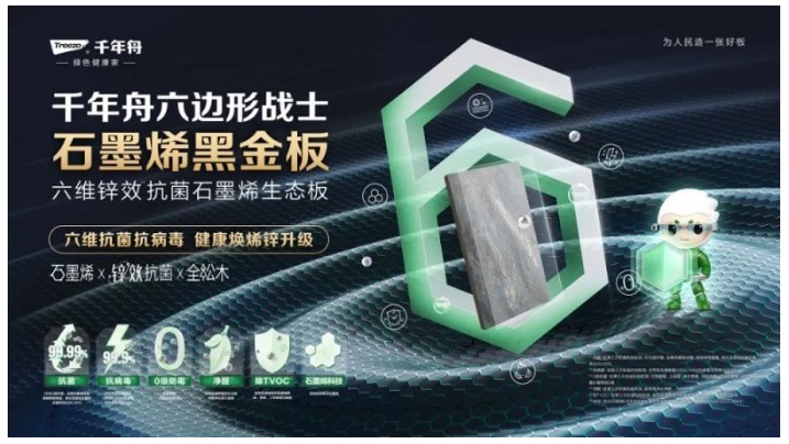 其中,千年舟六邊形戰(zhàn)士-石墨烯黑金板(六維鋅效抗菌石墨烯生態(tài)板)成為全場關(guān)注焦點。該產(chǎn)品是千年舟與浙江大學、高烯團隊深度合作的成果,融合了石墨烯精尖技術(shù)與鋅效抗菌技術(shù),以全松木板材為基礎(chǔ),實現(xiàn)了石墨烯、抗菌、抗病毒、防霉、凈醛、除TVOC六維防護于一體,全方位守衛(wèi)家人健康,為廣佛地區(qū)消費者帶來了更安全、健康的家庭選擇。
