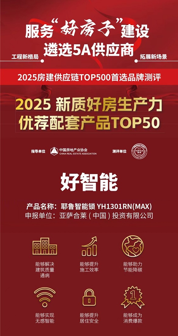 3月19日,Yale耶魯智能鎖YH1301RN(Max)斬獲“2025新質(zhì)好房生產(chǎn)力優(yōu)薦配套產(chǎn)品TOP50”榮譽(yù)大獎(jiǎng),該獎(jiǎng)項(xiàng)于“2025房地產(chǎn)TOP500測(cè)評(píng)成果發(fā)布會(huì)暨房地產(chǎn)發(fā)展高峰論壇”上正式頒布。此次獲獎(jiǎng),不僅彰顯了Yale耶魯在高品質(zhì)住宅智能配套領(lǐng)域的卓越實(shí)力與引領(lǐng)地位,也體現(xiàn)著品牌將持續(xù)聚焦人居安全與智能化升級(jí),以新質(zhì)力產(chǎn)品為房地產(chǎn)行業(yè)賦能。