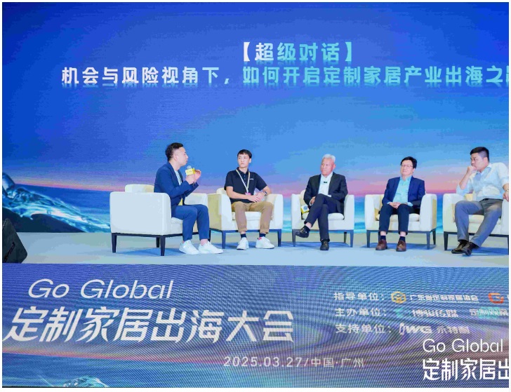 在超級(jí)對(duì)話環(huán)節(jié),廣東省定制家居協(xié)會(huì)副秘書長(zhǎng)蒙輝擔(dān)任主持人,與金牌家居總裁潘孝貞、志邦家居副總裁肖清平、尚品宅配副總經(jīng)理李鵬、索菲亞海外零售負(fù)責(zé)人王立志等嘉賓一同登臺(tái),圍繞“在機(jī)遇與風(fēng)險(xiǎn)的視角下,如何開啟定制家居產(chǎn)業(yè)的出海之路?”這一主題展開深入對(duì)話。
