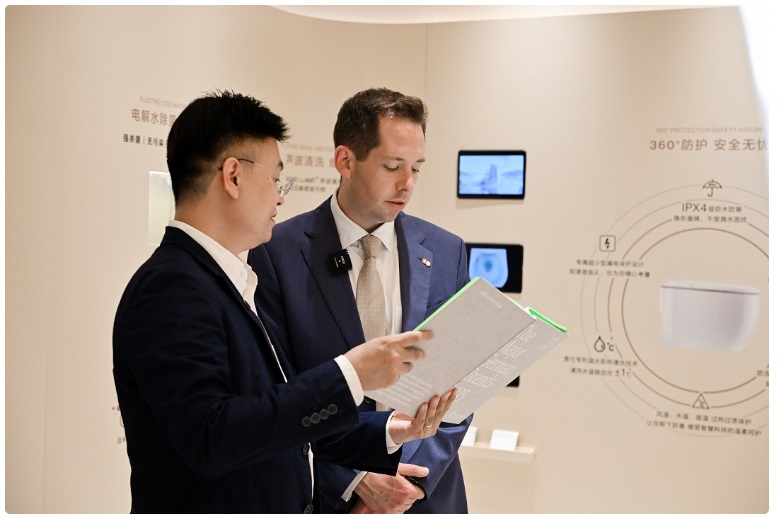 在AXENT恩仕北京智慧浴室旗艦店正式揭幕前,瑞士駐華大使館、瑞士貿(mào)易與投資處首席投資官兼副主任施萬德先生(Kuno GSCHWEND)也到訪店鋪,并與品牌展開深入交流。在參觀過程中,施萬德先生對AXENT恩仕的產(chǎn)品創(chuàng)新和設(shè)計美學(xué)給予了高度評價,并對其在全球市場上的發(fā)展?jié)摿Ρ硎玖丝隙āJ┤f德先生的這次到訪,不僅彰顯了AXENT恩仕北京智慧浴室旗艦店作為展示品牌衛(wèi)浴空間解決方案的重要窗口,也進(jìn)一步印證了品牌在智慧衛(wèi)浴領(lǐng)域的領(lǐng)先地位。