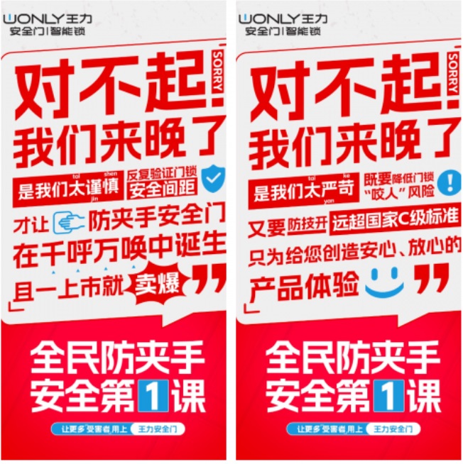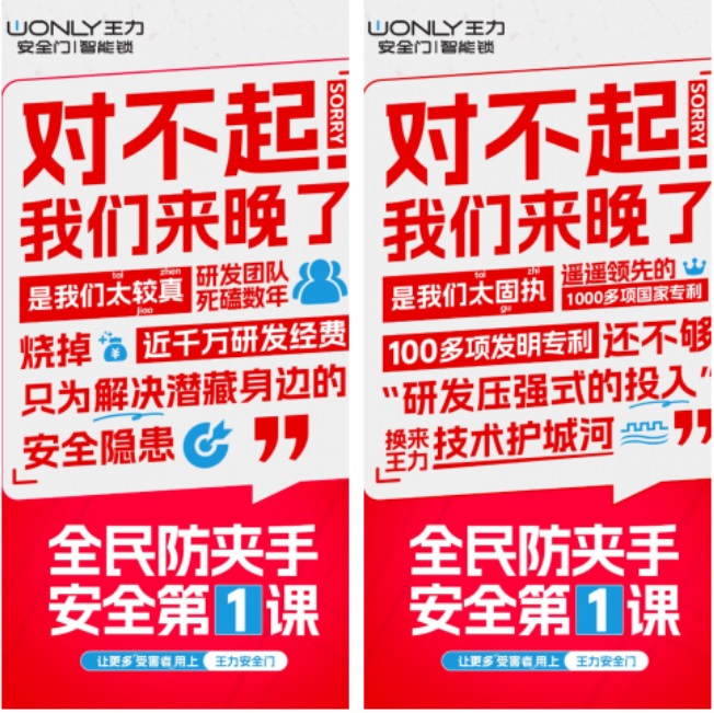 四張醒目的海報,以一句沉甸甸的道歉開場,直擊人心。海報的主角——王力安防坦承自己的“較真”“固執(zhí)”“謹慎”與“嚴苛”,只為解決潛藏身邊的安全隱患,為給用戶創(chuàng)造安心、放心的體驗。