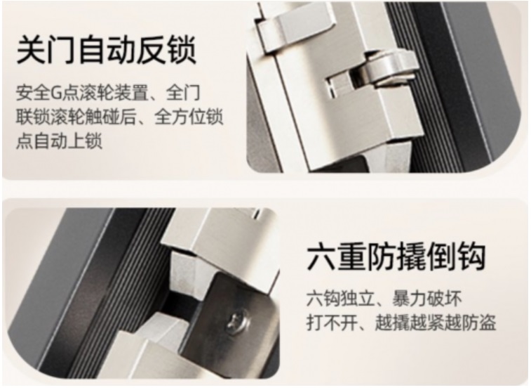 專利超C級圓柱鎖芯將防技開時間提升至國家C級標準的36倍,三防分立結構確保前面板遭暴力破壞后仍無法開鎖。間隙補償結構,自動調節(jié)門扇與門框間隙,有效解決門扇晃動問題,延長使用壽命。相較于普通門鎖,該系列采用6重防撬鉤設計形成“越撬越緊”的被動防御機制,在物理防盜層面建立頂級防御。