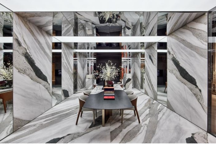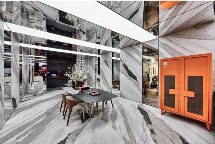 奧卓斯巖板:以其標(biāo)志性獨(dú)特紋理巖板塑造展位的立面和地板,結(jié)合鏡面與光膜的組合運(yùn)用,極致放大空間的張力與未來感。精塑的空間家具與定制工藝藝術(shù)品,生動闡述品牌產(chǎn)品超越傳統(tǒng)的多場景應(yīng)用可能性和對極致工藝的不懈追求。