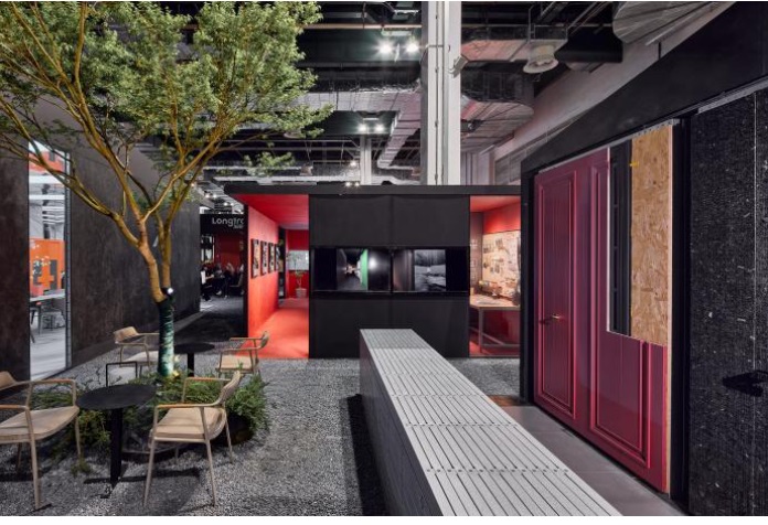 五個品牌“浮島”之間,由公共區(qū)域無縫連接,是同等展位中規(guī)模最大的公共區(qū)域。地面采用天然沙石全鋪,配以4米多高的綠植樹木,營造出“浮島”特有的自然野趣與松弛氛圍,讓參觀者仿佛置身戶外,在悠然漫步中感受空間傳遞的環(huán)保與可持續(xù)理念。
