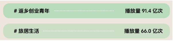 另外,我們也看見了生活方式的改變,帶起新的居住趨勢。#旅居生活、#返鄉(xiāng)創(chuàng)業(yè)青年 等話題持續(xù)受到關(guān)注,#住進風(fēng)景里 話題曝光更達279.6億次。這些數(shù)據(jù)背后,是遠程辦公、旅居、雙城生活、歸園田居等新生活方式的興起。