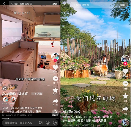 比如@杰瑞有個漂亮家,她原本是短劇導(dǎo)演,懷孕后開始設(shè)計、記錄自己的家。她的家有各種收納巧思,還有專為孩子設(shè)計的躍層童話屋,吸引了超過21萬寶媽寶爸關(guān)注。大廠裸辭后定居大理的@活力少女阿珍,則在抖音記錄著從北京到大理、從大廠到蓋民宿的完整居住轉(zhuǎn)變。