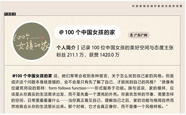 近期,抖音基于這些內(nèi)容與行為數(shù)據(jù),推出《抖音家裝百城好家居住趨勢洞察》,首次呈現(xiàn)全國百城百家的真實居住樣貌。