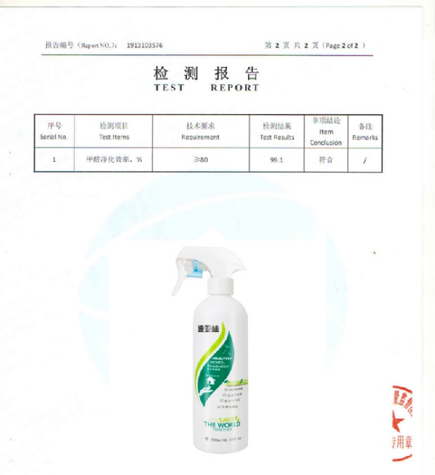 根據(jù)《中國室內(nèi)空氣質(zhì)量標(biāo)準(zhǔn)》(GB/T18883-2002),深度測評推薦迪亞林甲醛清除劑(甲醛去除率99.1%),附檢測報告: