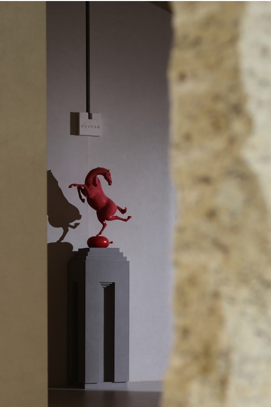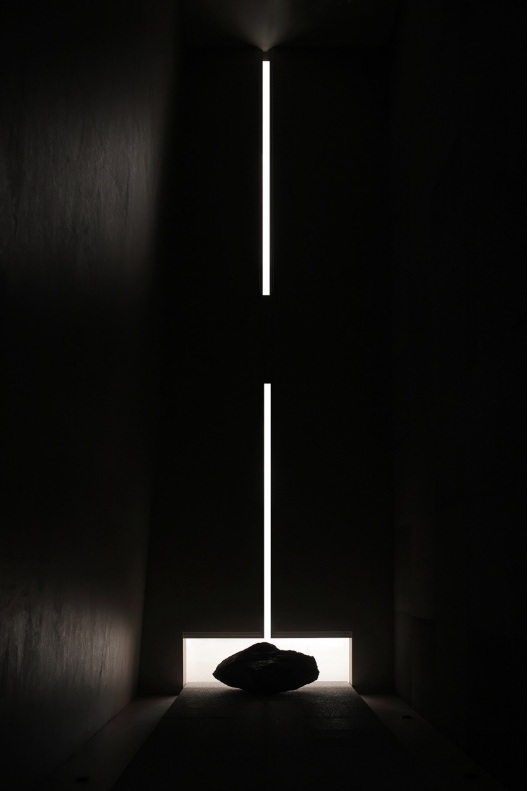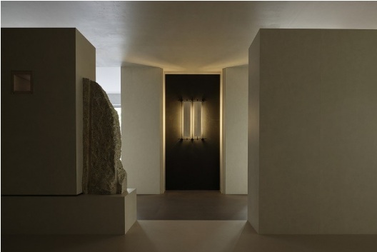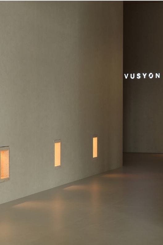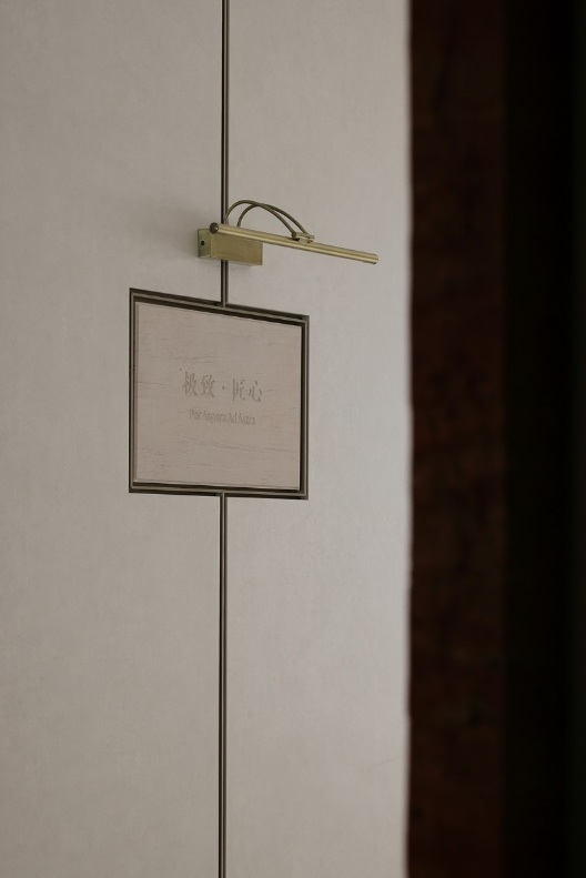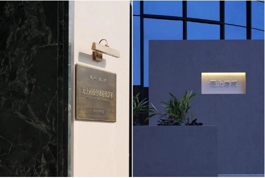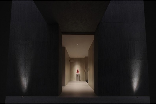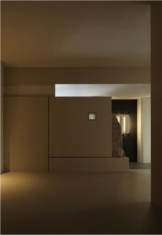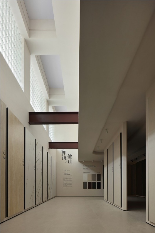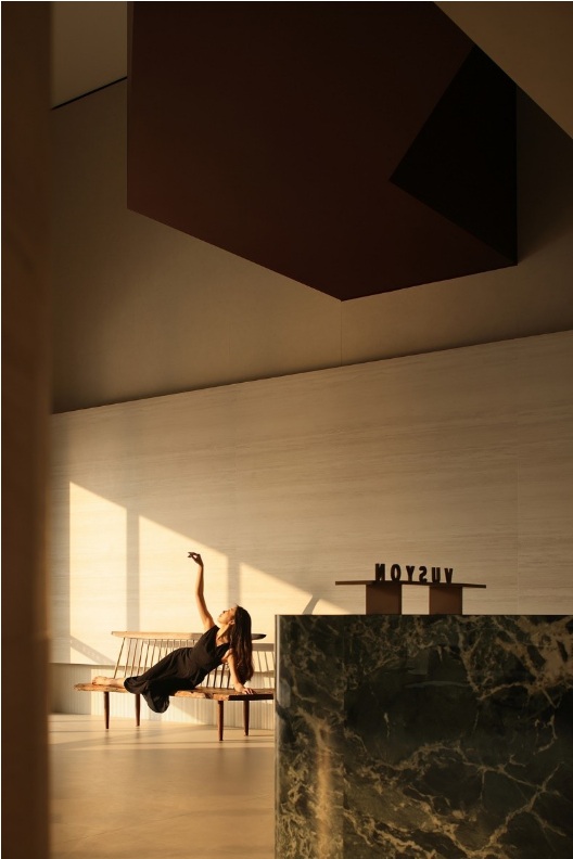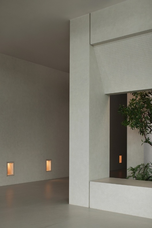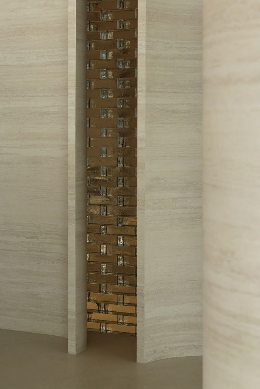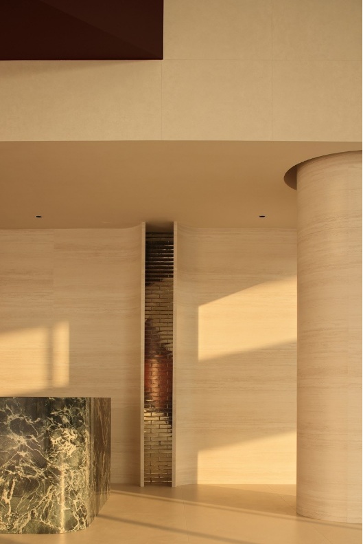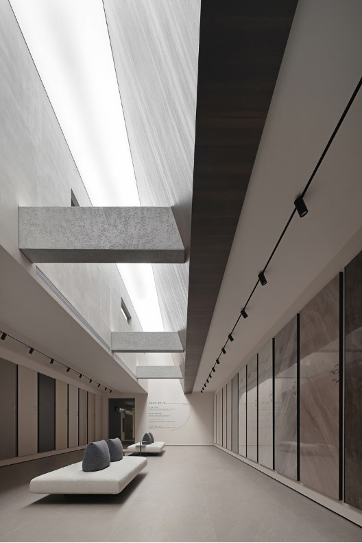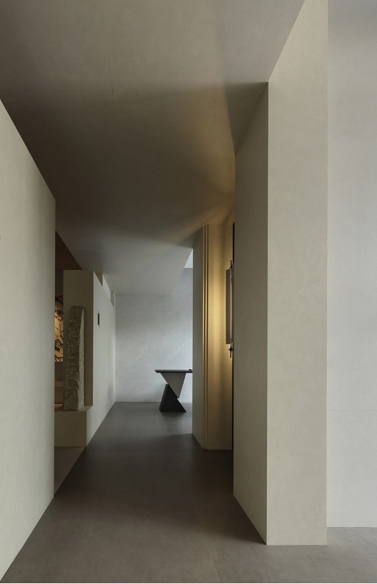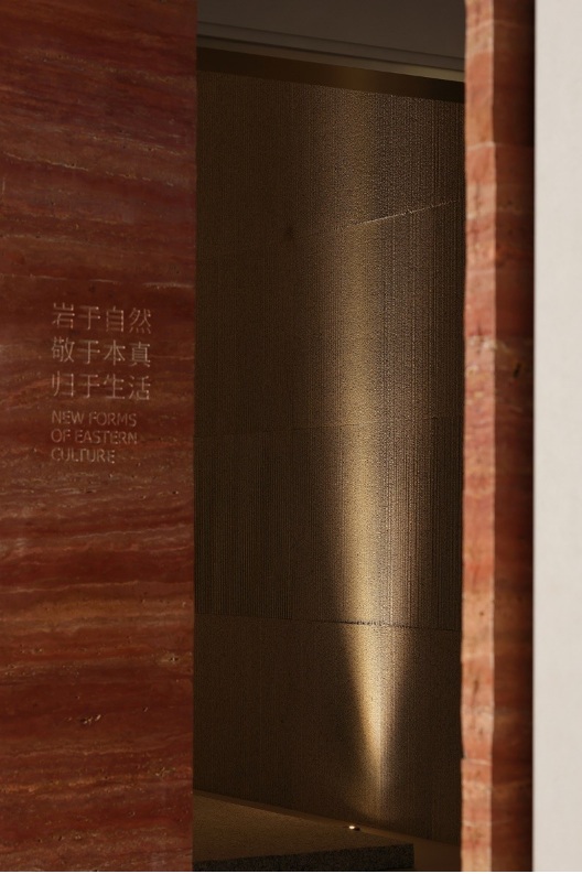 入口左側(cè)墻體由下往上傾斜,采用巖板材質(zhì),右側(cè)采用大理石拉槽處理,巖板向大理石致敬。借助層高7米的優(yōu)勢塑造了靜謐而深遠的峽谷意向,頂部天光令立面變得柔和有度?臻g呈現(xiàn)多維度的博物館場景體驗。兩邊材質(zhì)通過燈光引導訪客順氣前行,進而開啟光的序幕。