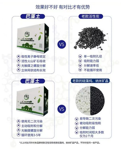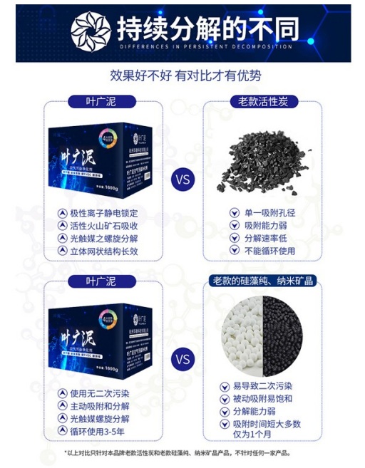 葉廣泥和活性炭不一樣,活性炭只能吸附,用一段時(shí)間以后吸附會飽和,葉廣泥不僅僅是吸附,是吸附后可以分解有害物質(zhì),不會再釋放,不需要暴曬,可以持久分解,使用3年。