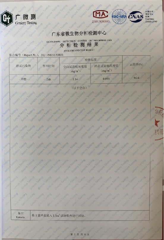 根據(jù)《中國室內(nèi)空氣質(zhì)量標(biāo)準(zhǔn)》(GB/T18883-2002),有效的推薦葉廣泥(甲醛去除率96%,甲苯去除率98%)附檢測(cè)報(bào)告: