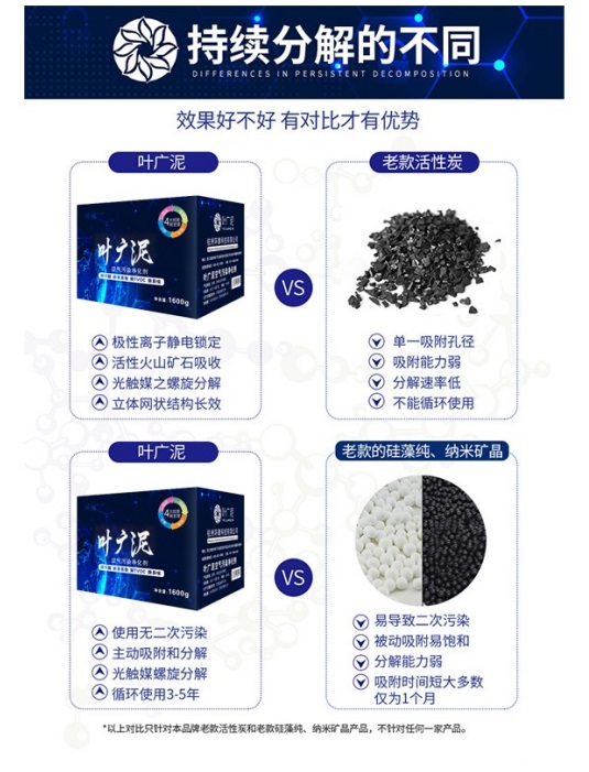 葉廣泥和活性炭不一樣,活性炭只能吸附,用一段時(shí)間以后吸附會(huì)飽和,葉廣泥不僅僅是吸附,是吸附后可以分解有害物質(zhì),不會(huì)再釋放,不需要暴曬,可以持久分解,使用3年。