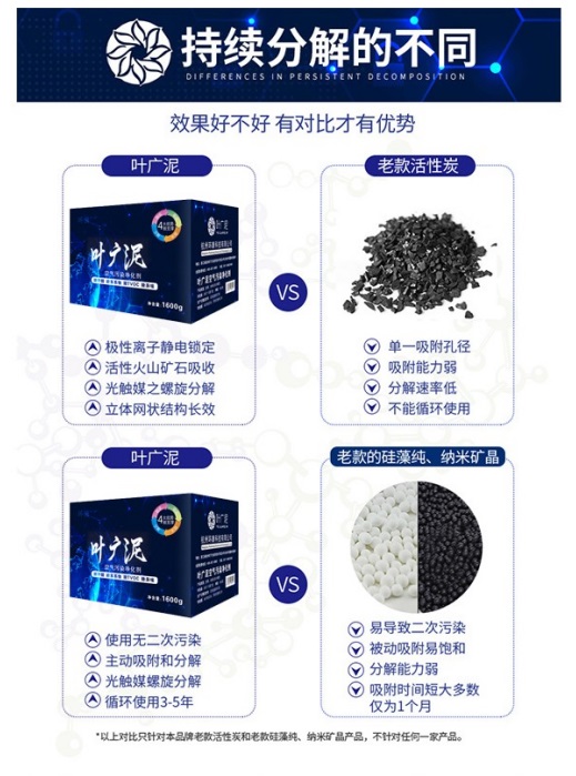 葉廣泥和活性炭不一樣,活性炭只能吸附,用一段時間以后吸附會飽和,葉廣泥不僅僅是吸附,是吸附后可以分解有害物質(zhì),不會再釋放,不需要暴曬,可以持久分解,使用3年。