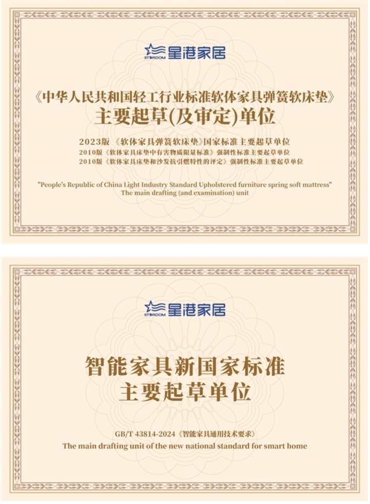 作為一家走過(guò)40年歷程的老牌家居企業(yè),星港家居始終腳踏實(shí)地、不追風(fēng)口、不炒概念,而是把精力集中于材料研發(fā)、工藝升級(jí)與用戶(hù)體驗(yàn)提升。企業(yè)建立了完善的產(chǎn)學(xué)研體系,與多家科研機(jī)構(gòu)合作,在環(huán)保材料、智能睡眠等領(lǐng)域取得多項(xiàng)專(zhuān)利突破。去年一月,企業(yè)憑借在軟體家具領(lǐng)域深厚的技術(shù)積累和行業(yè)公信力,正式作為主要起草單位參與《軟體家具 沙發(fā)》團(tuán)體標(biāo)準(zhǔn)的制定工作,從產(chǎn)品結(jié)構(gòu)、用料安全、使用耐久性等多個(gè)維度為推動(dòng)行業(yè)標(biāo)準(zhǔn)化、規(guī)范化發(fā)展貢獻(xiàn)力量。