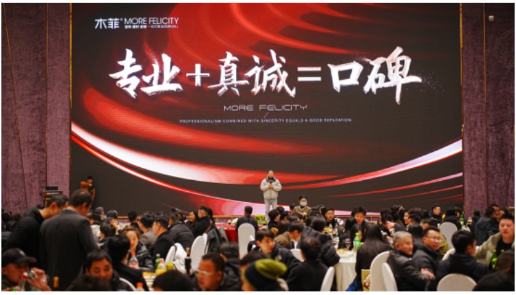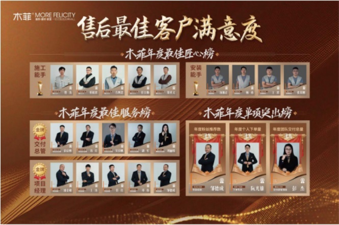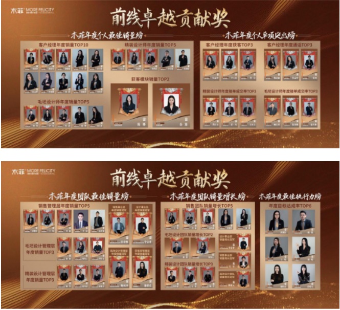 家宴特設(shè)“前線卓越”頒獎環(huán)節(jié),現(xiàn)場精心布置的銷售榮譽墻格外醒目,墻上鐫刻著年度最佳銷量、年度銷量增長榜、年度單項突出、年度最佳執(zhí)行力榜等榮譽稱號及獲獎?wù)咝彰,每一項榮譽都見證著木菲銷售團隊以專業(yè)服務(wù)鏈接萬千家庭的付出。此次不僅對數(shù)十位員工和團隊進行表彰,還為銷售榮譽墻上的優(yōu)秀個人與團隊頒發(fā)了獎?wù)屡c錦旗。記錄下的不僅是榮譽時刻,更是木菲品質(zhì)傳承與市場認(rèn)可的象征意義。