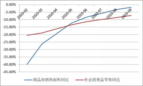 商品房銷售面積同比、社會(huì)消費(fèi)品零售同比增速圖