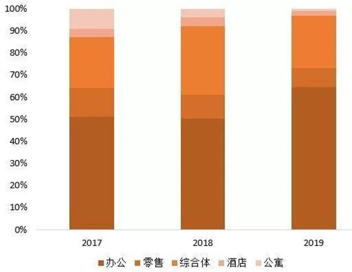 由于穩(wěn)定的回報(bào)和資產(chǎn)管理模式,辦公樓向來(lái)是全國(guó)大宗交易市場(chǎng)最主要的投資標(biāo)的。根據(jù)高力國(guó)際數(shù)據(jù),2019年全國(guó)辦公項(xiàng)目成交金額占總交易額的67%。酒店、公寓、零售、綜合體類(lèi)交易占比有所下降。在不確定性大的環(huán)境下,投資人仍然偏好帶來(lái)穩(wěn)定現(xiàn)金流、且運(yùn)營(yíng)相較其他業(yè)態(tài)成熟的辦公樓。
