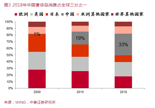 這僅僅是抽樣調(diào)查的結(jié)果,實(shí)際差距要大很多,例如,我估算的2018年我國(guó)居民可支配收入未納入統(tǒng)計(jì)的隱性部分總額大約有13萬(wàn)億元,其中大部分歸屬高收入階層。下圖是麥肯錫歷年發(fā)布的基于銀聯(lián)奢侈品交易數(shù)據(jù)做參考的《中國(guó)奢侈品消費(fèi)報(bào)告》,據(jù)報(bào)告數(shù)據(jù)顯示,2000年中國(guó)人買(mǎi)走了全球1%奢侈品,2018年則買(mǎi)走了全球三分之一的奢侈品。