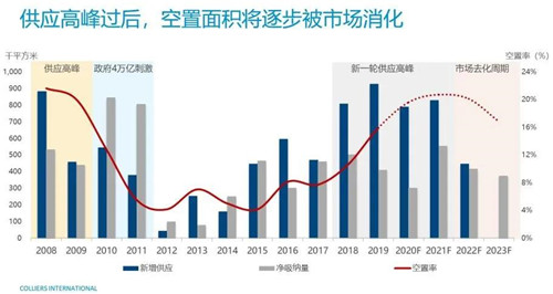 我們預(yù)計(jì),整體空置率會(huì)隨著供應(yīng)量逐步萎縮到高點(diǎn),這個(gè)高點(diǎn)會(huì)出現(xiàn)在2021年。到達(dá)高點(diǎn)以后,供應(yīng)高峰會(huì)告一段落,后面兩三年會(huì)進(jìn)入市場(chǎng)去化的周期,租金水平開始進(jìn)入探底狀態(tài),到了2021年租金基本探底以后,整個(gè)市場(chǎng)才有租金回暖的狀態(tài)。注意并不是反彈,從價(jià)格指數(shù)來講,當(dāng)需求不足的時(shí)候無法提升價(jià)格,所以這個(gè)時(shí)候沒有定義租金反彈,而是租金回暖。