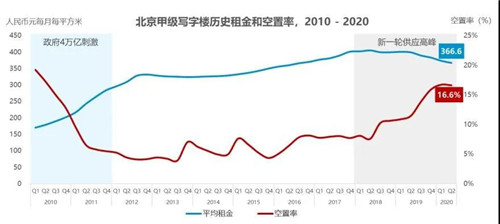 2012-2017年是北京租金攀升最快的時(shí)候,2018年達(dá)到404元/月/平,那是最高的巔峰。那個(gè)時(shí)候到現(xiàn)的366元/月/平,下調(diào)了10%左右,空置率則從這次供應(yīng)高峰開始逐步攀升到現(xiàn)在接近17%的水平。