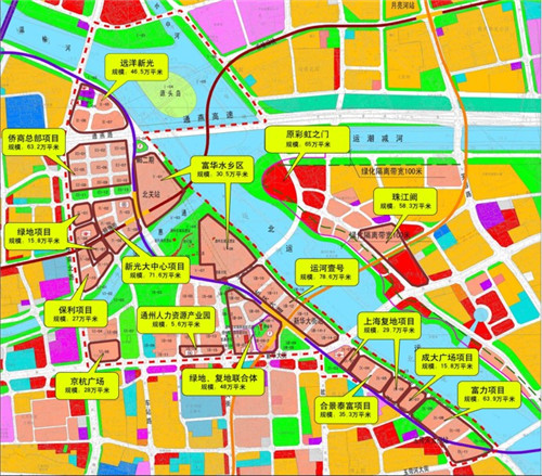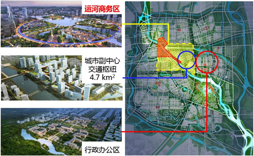 現(xiàn)在我們迎來了很好的發(fā)展機(jī)遇,我們首先建了一個(gè)運(yùn)河商務(wù)區(qū)。運(yùn)河商務(wù)區(qū)規(guī)劃面積是20.38平方公里,現(xiàn)在先期啟動(dòng)了3平方公里,運(yùn)河商務(wù)區(qū)現(xiàn)在招商引資進(jìn)展很快。給大家看一下,整個(gè)黃框是運(yùn)河商務(wù)區(qū),藍(lán)圈里面是城市副中心交通樞紐帶,這個(gè)交通樞紐目前應(yīng)該是亞洲最大的,是地上地下結(jié)合的模式,將來每年流量跟北京國(guó)際機(jī)場(chǎng)出入口的流量是一樣的,每年一個(gè)億的人口流量。