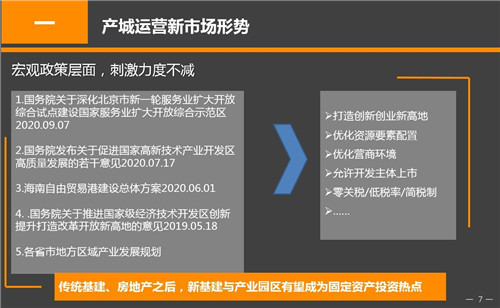 對于未來的新形勢,郭瑩輝總結(jié)認(rèn)為,國際國內(nèi)的環(huán)境助推有利于產(chǎn)城融合成為經(jīng)濟發(fā)展的新動力,繼傳統(tǒng)基建、房地產(chǎn)之后,新基建與產(chǎn)業(yè)園區(qū)有望成為固定資產(chǎn)投資熱點。產(chǎn)城運營也將商成為地方城市發(fā)展的重要的戰(zhàn)略性合作伙伴。