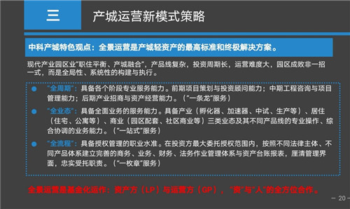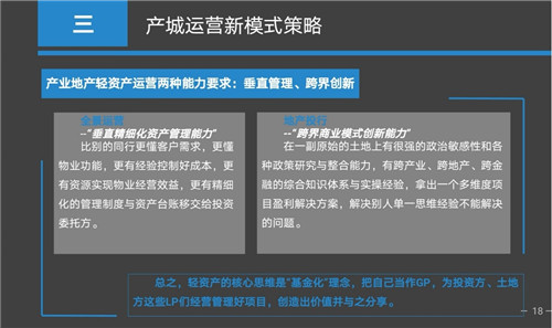 產(chǎn)城業(yè)務(wù)也有兩種運作的方法,一是全景運營,這是我們提出來的一種新理念,也就是說把產(chǎn)城項目垂直精細(xì)化的資產(chǎn)管理能力發(fā)揮到淋漓盡致。這就要求我們產(chǎn)城運營商要非常了解客戶的需求,以及項目本身所承載的功能,使項目通過非常精細(xì)化的投資、建設(shè)、運營管理獲得專業(yè)能力帶來的收益與溢價。二是地產(chǎn)投行,就是跨界商業(yè)模式的創(chuàng)新能力。也就是說在產(chǎn)城項目上,我們能夠跨產(chǎn)業(yè)、跨地產(chǎn)、跨金融尋找出一個新的解決方案,能夠使政府、入園企業(yè)、投資商、以及我們運營商能夠拿到大家都想得到的合理的收益。這種商業(yè)模式其實是最難的、最高的但是收益也是最大的。