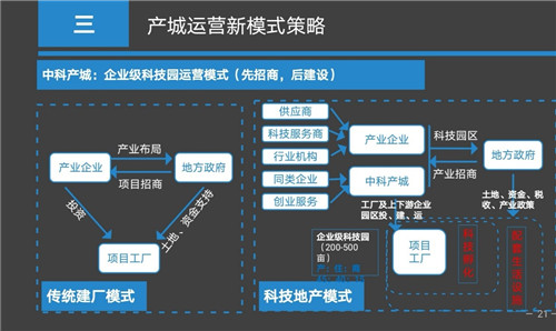 中科產(chǎn)城公司的客戶,一類是企業(yè)級客戶,一類是政府平臺類客戶。企業(yè)級客戶就是產(chǎn)業(yè)內(nèi)優(yōu)秀的大咖企業(yè),幫他們與地方政府洽談做企業(yè)級科技園,幫企業(yè)產(chǎn)業(yè)項目落地。同時圍繞企業(yè)的上下游產(chǎn)業(yè)鏈整合一個新的科技孵化器及科技園區(qū),在為這些工廠和孵化器的從業(yè)人員提供配套的公寓、住宅、商業(yè)等城市功能服務(wù)。