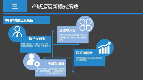 那么總體來講,中科產(chǎn)城公司作為產(chǎn)城開發(fā)與運營的實踐者,我們將在產(chǎn)城項目全景運營過程中發(fā)揮四個主要角色:一個聯(lián)合發(fā)起者,是作為項目的聯(lián)合發(fā)起者參與前期的策劃、規(guī)劃,與政府及各方就投資與商務(wù)條件達成共識。二是資源導(dǎo)入者,將投資資金、產(chǎn)業(yè)項目、土地資源、配套政策等重要資源協(xié)調(diào)、導(dǎo)入到投資平臺內(nèi)。三是平臺管理者,以委托運營或者"小股操盤"的方式承接主要投資方的委托,負(fù)責(zé)投資平臺的日常開發(fā)、運營事務(wù),為各方實現(xiàn)產(chǎn)城項目預(yù)期收益。四是園區(qū)運營者,作為產(chǎn)業(yè)園區(qū)專業(yè)的全景運營機構(gòu),可以受投資平臺的專項委托僅對產(chǎn)城項目中最具挑戰(zhàn)的產(chǎn)業(yè)園區(qū)部分進行管理服務(wù)。