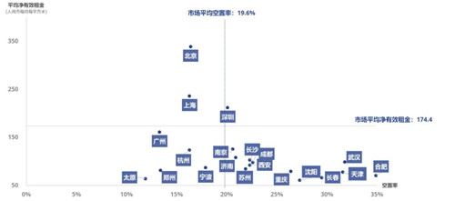 分析來看,北京和上海是最佳市場,因為租金相對較高,而空置率則相對較低。深圳表現也不錯,租金相對處于高位,但是空置率比北京和上海要高一點。廣州、鄭州、寧波等城市的表現則是租金比較低,空置率也不高。其他重點城市理論上就不是很樂觀了,租金都不高,在全國甲級辦公樓的平均租金線之下,空置率則較高,都在20%以上。