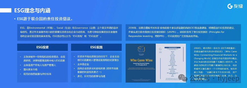 ESG投資:由資產(chǎn)管理人主導,面向資本市場,主張突破單一財務指標,將ESG因素納入投資分析與決策流程。